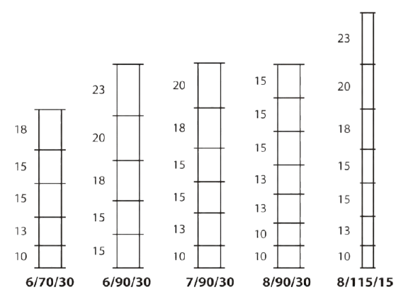 Heavy gal fencing. 13 graduated horizontal wires (closer together at the bottom), 15cm between the vertical wires, high-tensile 2mm line and picket wires, 2.5mm top and bottom wires.